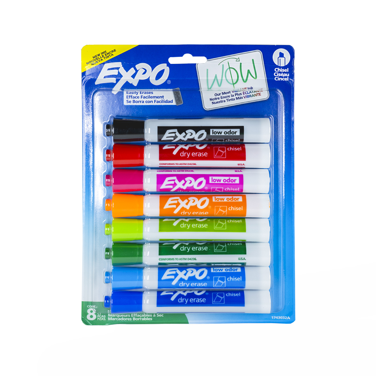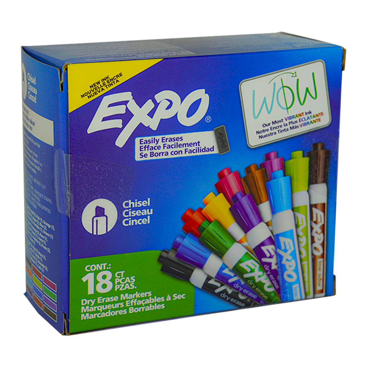 Marcador para pizarron blanco. Nueva tinta que permite un borrado con mayor fácilidad. Punta de cincel. 18 diferentes colores
