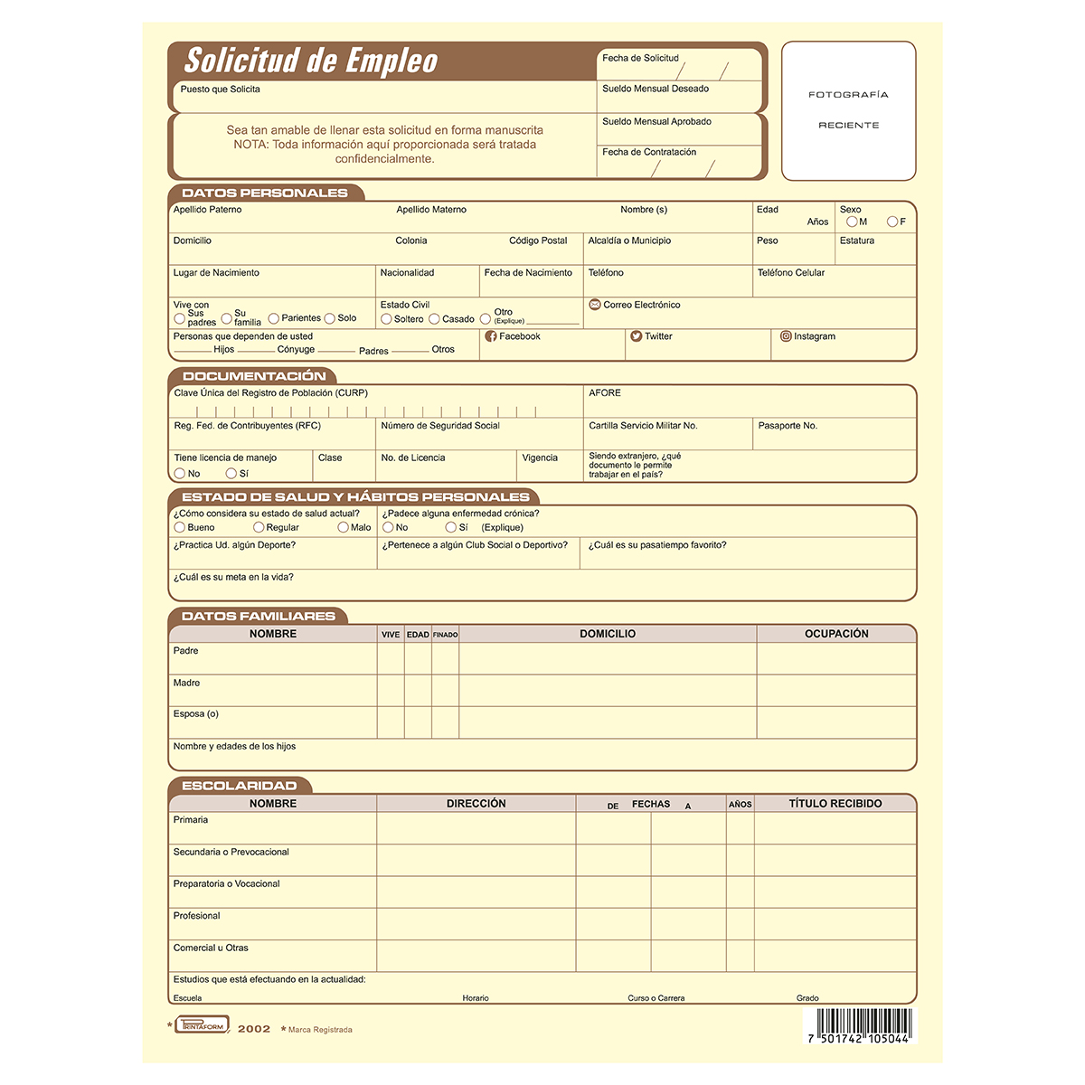 Block tamaño carta con 25 hojas de solicitud de empleo