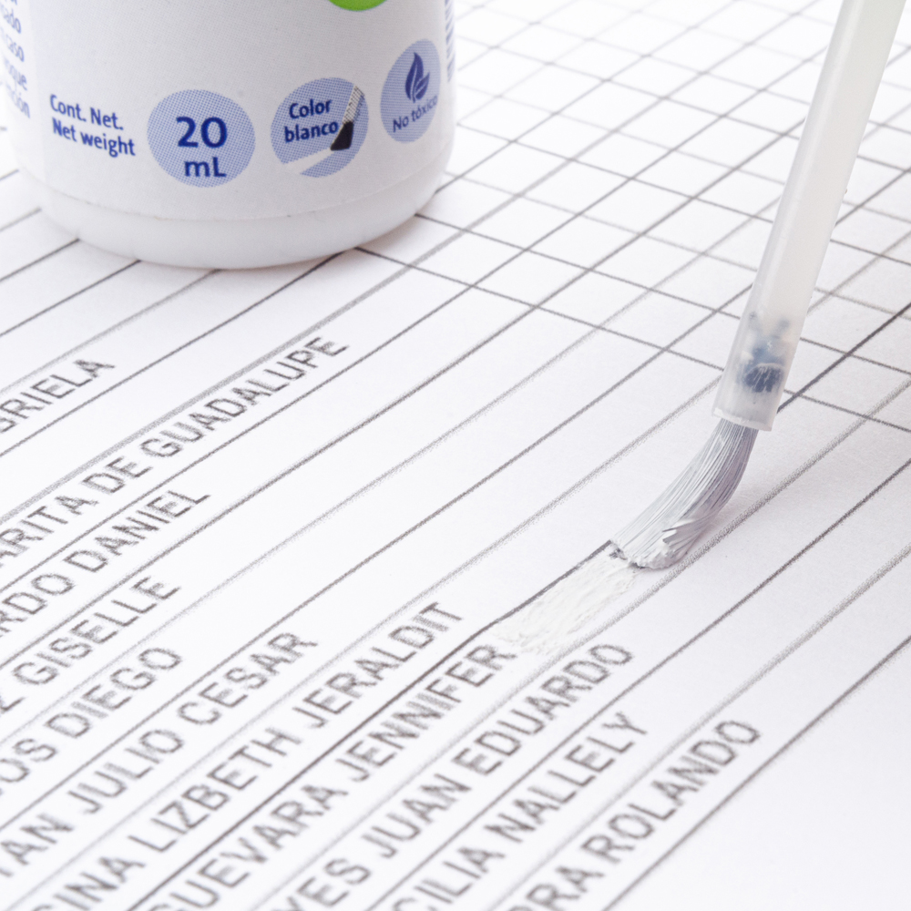 Recubrimiento liquido sin textura ideal para corregir errores de escritura mejor funcionamiento sobre papel blanco.
