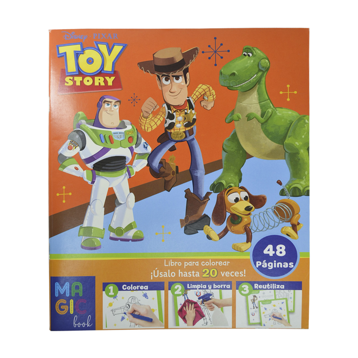 Este Libro Mágico para Colorear Toy Story combina diversión y aprendizaje creativo con páginas que los niños pueden colorear una y otra vez gracias a su formato mágico reutilizable. Perfecto para mantener a los pequeños entretenidos mientras practican coordinación, creatividad y concentración con sus personajes favoritos de la saga Toy Story en cada página.